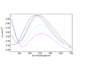 Time-resolved emission maps were performed in an FLS980 Fluorescence Spectrometer equipped with double excitation and emission monochromators, a photomultiplier tube detector (PMT-900) and a 450 W Xe lamp for steadystate spectral measurements. A Q-switched Nd: YAG laser (Continuum, Minilite) directly coupled to the spectrometer in L geometry was used as excitation in time-resolved measurements. The fundamental frequency of the laser was tripled, generating 355 nm light pulses of 4 ns pulse width at a repetition rate of 10 Hz and irradiance of 18 mW/cm2. Gratings blazed at 400 nm were used in the excitation and emission arms, with higher diffraction orders being filtered by the integrated long wave-pass filters in the FLS980.