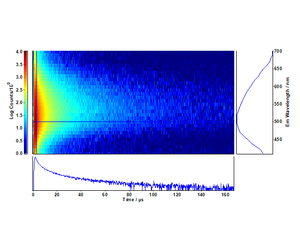 The distinctive decay kinetics of TiO2 and Cu-N-TiO2 are evident in the time-resolved emission maps of Figures 1 and 2, respectively. Particularly exciton emission at 410 nm in pure TiO2 is completely quenched in favour of the Cu-N defect states associated to the nano-columns formed at the surface of the deposited films.10,11