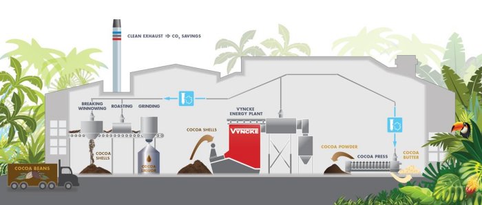 Cocoa shells making steam for bean processing - Energy