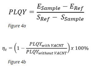 Which gives a transfer efficiency of 86% using the PLQY values of 0.14% and 0.02%. For an accurate calculation of the transfer efficiency, the PLQY of the sample without the transfer layer should be measured on an inert substrate such as SiO2 where no transfer can be assumed to occur. Here, PLQYwithout VACNT was measured on an ITO coated substrate into which some hole transfer will occur, and the 86% is therefore the lower bound of the transfer efficiency.