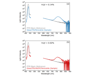 The PLQY of the Glass/ITO/Perovskite was calculated to be 0.14% compared to 0.02% for the Glass/ITO/VACNT/Perovskite which confirms that the VACNT layer is suppressing radiative recombination in the perovskite layer due to improved hole extraction. The ratio of the PLQY values is 0.14, which is close to the PL intensity ratio of 0.15 obtained from the relative intensity method. The close agreement can be attributed to the perovskite samples having identical substrates, positioned as alike as possible, and the VACNT layer not appreciably changing the reflection and absorption properties of the sample. This result shows that the relative method is representative when these conditions are met but the sphere method will always give a more accurate comparison, provide greater flexibility, and importantly allow the PLQY of each sample to be calculated where the relative approach gives only the ratio.