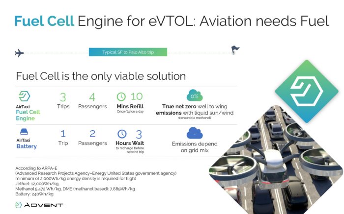 Airtaxis, eVTOLs, Commercial Delivery, Drones Aviation is ripe for electrification, but batteries are not the solution. When it comes to commercial and mission-critical applications autonomy and utilization are all that matters. Renewable fuels that pack 30x the power of batteries are the answer and the vision of Advent Technologies. Advent’s HT-PEM technology is made with these fuels in mind. DME, eMethanol (aka liquid sun, liquid wind), are examples of renewable fuels. Partner with Advent for carbon-neutral net-zero emissions well to wing aviation.
