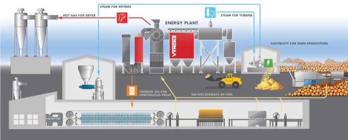 MDF production requires large amounts of energy. Most of the demand of energy is thermal: steam for the cooking and refining process, hot gas for drying and thermal oil for the continuous press. VYNCKE offers customized energy solutions, burning a wide variety of process fuels and external fuels (all types of biomass). The energy plant can be designed to produce steam in a direct way (through an integrated steam boiler) or in an indirect way via a thermal oil-steam heat exchanger. The system can be adjusted to produce electricity.