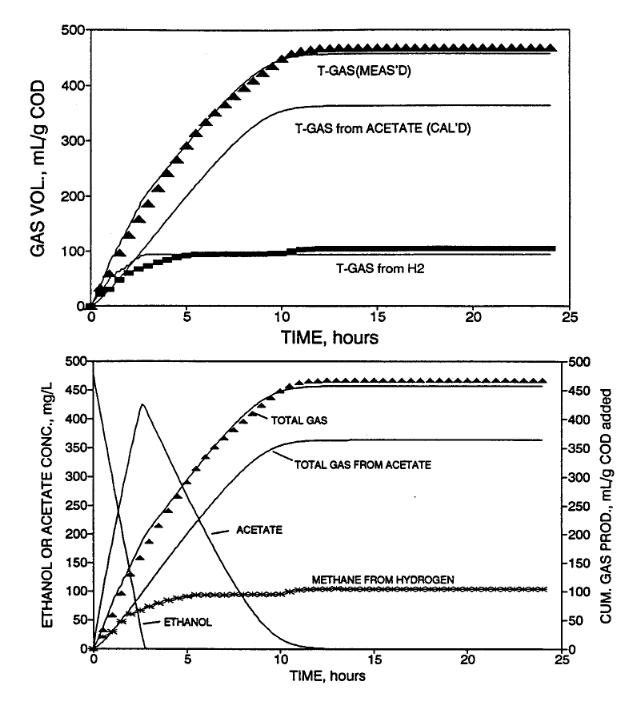 Analysis: The amount of methane produced from acetate and hydrogen agreed closely with the amount estimated using biological growth and substrate conversion relationships.