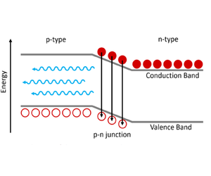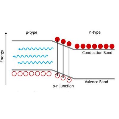 An LED consists of a chip of semiconducting material that has been doped to create a p-type region and an n-type region. The p-type region contains an excess of holes while the n-type has an excess of electrons. At the interface between these two regions, a p-n junction is formed which is the light emission region of the LED. A schematic of charge carrier recombination at the p-n junction in an LED is shown in Figure 2. When a voltage is applied across the semiconductor the holes in the p-type region and electrons in the n-type region will drift towards the p-n junction where they will recombine. The recombination of an electron with a hole releases a photon with an energy approximately equal to the energy bandgap between the valence and conduction bands.