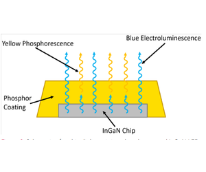 The fact that the energy of the emitted photons is determined by the bandgap of the semiconductor poses a problem for the generation of a white light LED, since the emission spectrum of the LED will be narrowly centred around the bandgap energy. The most widely adopted solution to this problem is to coat the LED with a layer of phosphor, the principle of which is illustrated in Figure 3. In this approach the bandgap of the semiconductor is tuned so that the electroluminescence is in the blue region of the spectrum. Some of these blue photons pass through the phosphor unperturbed while others are absorbed, causing it to phosphoresce at a longer wavelength. The combination of the direct blue electroluminescence and the secondary yellow phosphorescence then produces white light. By tuning the bandgap of the semiconductor, the choice of