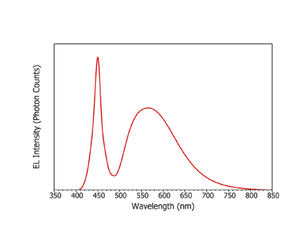 The electroluminescence emission spectrum of the LED is shown in Figure 4. It can be seen that the emission consists of a narrow emission peak centred on 450 nm which corresponds to the blue electroluminescence directly from the InGaN semiconductor and a broad emission centred on 570 nm from the phosphor coating.