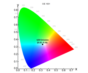 It is difficult to visualise the colour of the LED solely using the emission spectrum in Figure 4. The solution to this is to replot the emission spectrum as a chromaticity diagram, which describes the colour quality of an emission independently of its luminance. The Fluoracle® software of the FLS1000 has a built-in wizard to generate a chromaticity plot from any emission spectrum, in either CIE 1931 or CIE 1976 colour space. The chromaticity coordinates of the LED electroluminescence was calculated in CIE 1931 colour space and are shown in Figure 5. The LED emission has coordinates of (0.32, 0.33) which is close to the achromatic point of (0.33, 0.33) and the LED therefore produces a good rendition of white light.