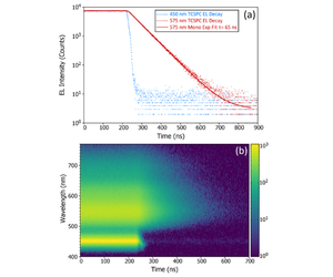 measurements were performed using the FLS1000 Photoluminescence Spectrometer equipped with a PMT-900 detector. For steady state electroluminescence measurements, the current through the LED was set to 20 mA (3.4 V) using a Keithley 2400 Source Measure Unit. For time-resolved electroluminescence measurements, square 3.5 V voltage pulses with a pulse duration of 2.5 μs and a repetition rate of 100 kHz were applied to the LED using an arbitrary function generator (N-M06). The EL decays following the voltage pulse were measured using Time-Correlated Single Photon Counting (TCSPC).