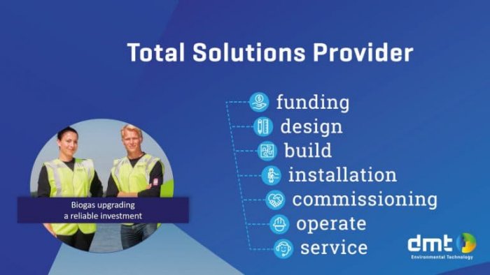 Introduced to minimise risk for funders and lead contractors, DMT’s new ethos – Total Solutions Provider (TSP) – aims to bring a step-change to the industry and provide a simple yet effective solution to guarantee the highest possible project efficiencies. A switch from technology provision to end-to-end service partnership, TSP supports the customer from the moment biogas leaves the digester to when it’s injected directly into the grid.