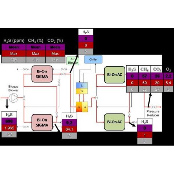 As can be seen, H2S was successfully removed in both lines and only during certain episodes, where peaks were measured, significant amounts of H2S were detected at the outlet of the first stage, but always maintaining removal efficiency values of more than 95% (Figures 2). Either way, the second vessel filled with CA Bi-On, not only removes siloxanes and VOCs, but acted as a polishing stage that resulted in negligible H2S concentrations after the overall purification system.