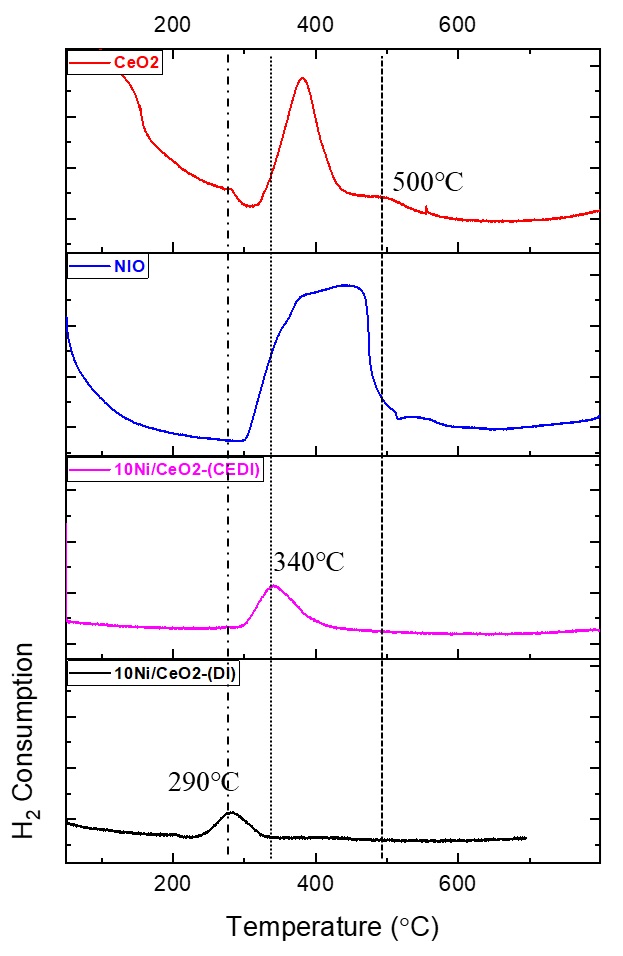 probe crucial physiochemical properties directly affected by the CEDI synthesis method. These included: H2-chemisorption to quantify dispersion of active sites, temperature-programmed reduction (H2-TPR) to assess the metal-support interaction and bulk phase reducibility of the catalysts, and Oxygen-temperature-programmed oxidation (O2-TPO) to evaluate carbon deposited on the catalysts.