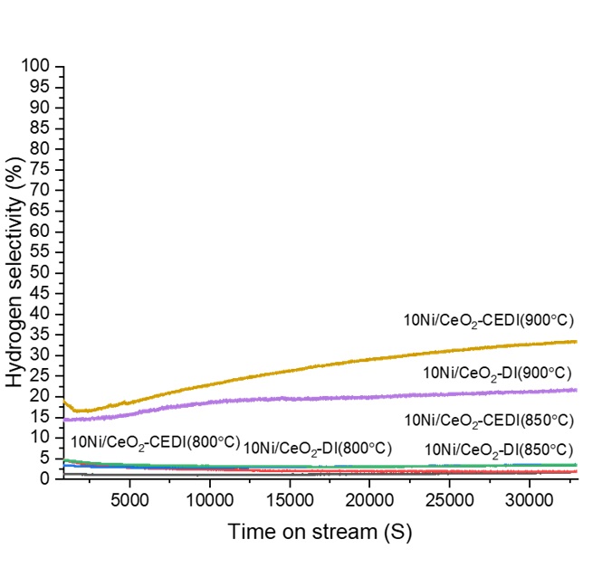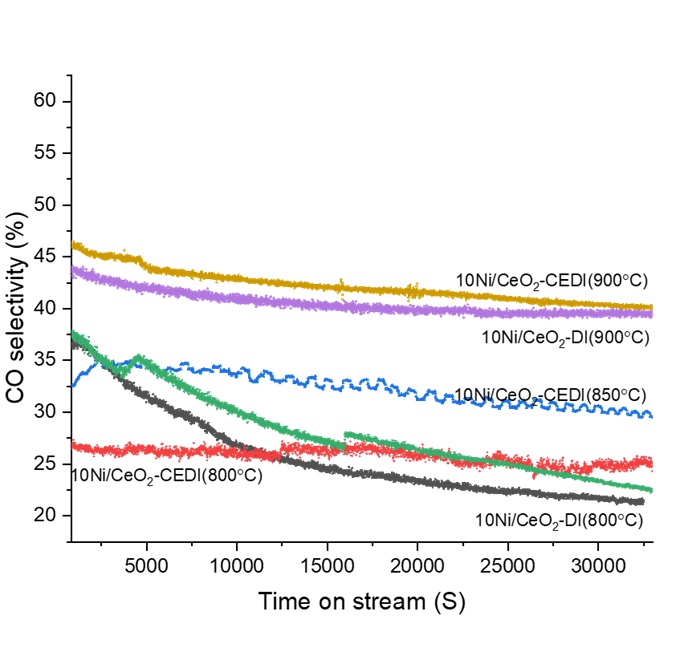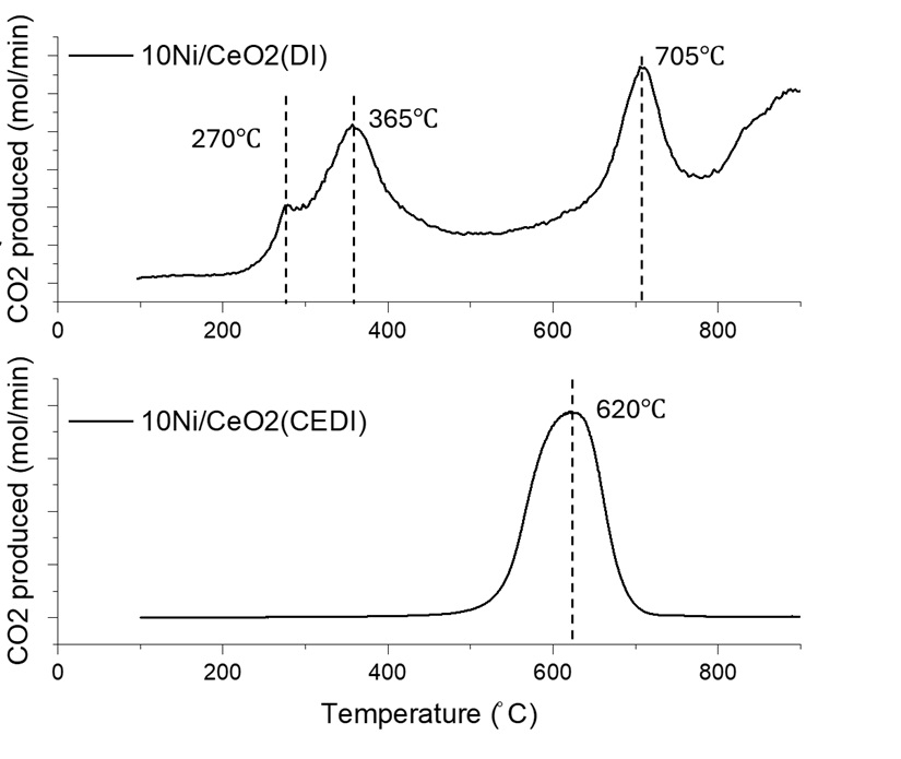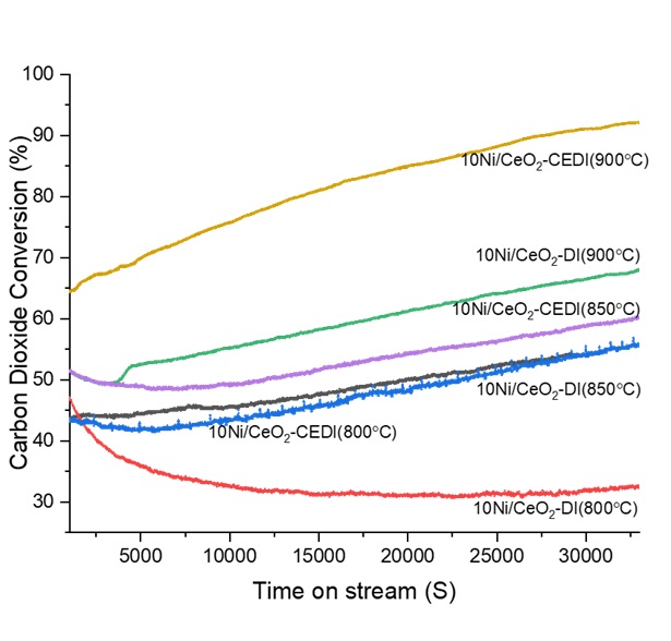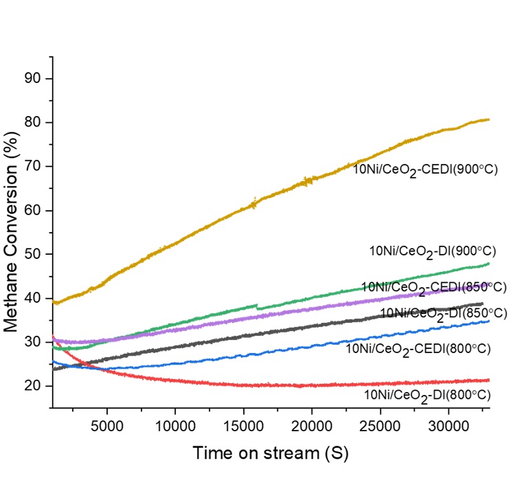 Figure 2 (left). O2– TPO profiles of 10Ni/CeO2-DI and 10Ni/CeO2-CEDI catalysts synthesised by DI and CEDI methods. The experimental conditions for these results include a model biogas feed ratio of CH4/CO2=1, GHSV of 7500 mL/h⋅gcat, and a reaction time of seven hours.