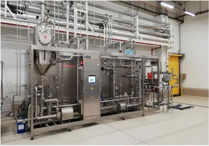 Because of the high heat transfer rates of the corrugated tube technique, HRS’s pasteurisation systems use water at a lower temperature to reduce the risk of product damage. Another benefit of higher heat transfer rate is that the system footprint can be reduced using shorter heat exchanger pipes. The shorter length of the heat exchanger also results in a reduction in pressure drop, which saves pumping power and reduces energy costs – often by 40%.