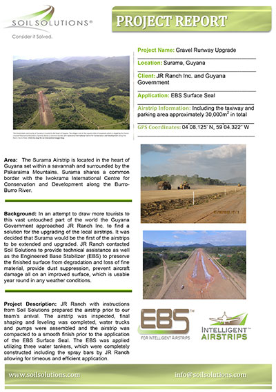 The Government of Guyana is implementing a plan to expand its tourism industry. Due to the remoteness of these locations, they knew the importance of developing the infrastructure in these areas, and started with Airstrips, the first being Surama. JR Ranch was the appointed contractor who together with Soil Solutions constructed the 1.2 km x 30 m wide airstrip using ENGINEERED BASE STABILIZER.