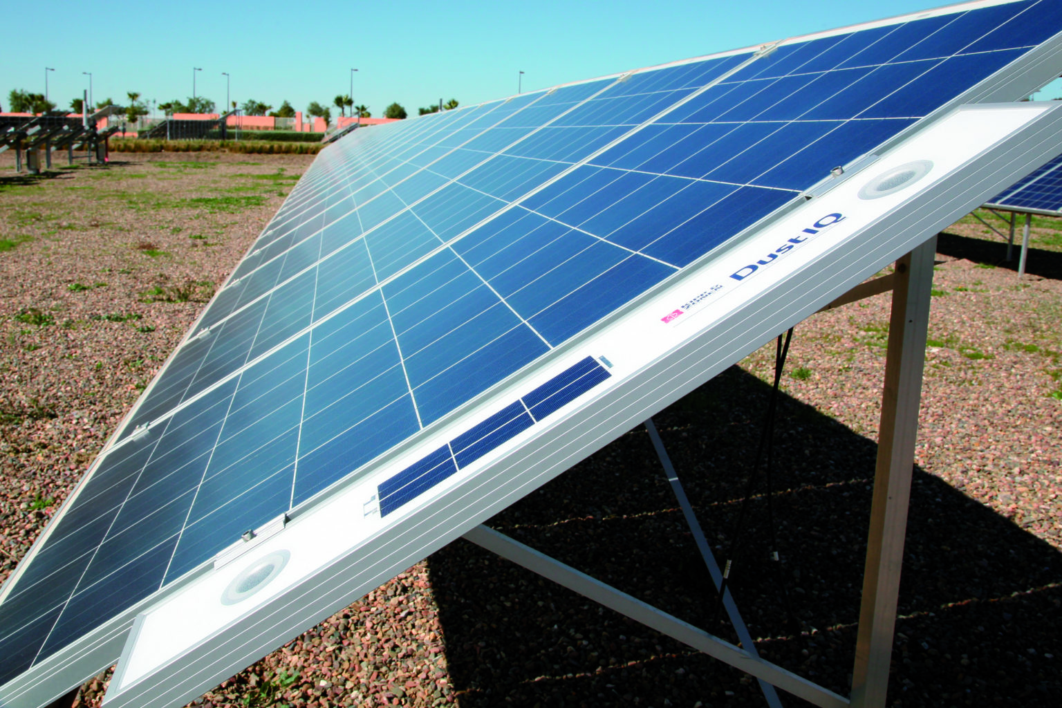 What makes the DustIQ unique is that it requires no routine cleaning or mechanical maintenance. It can be easily mounted between framed PV modules on both fixed and tracked sites. You clean the DustIQ when the modules themselves are cleaned.