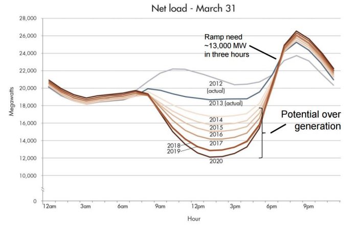The graph starts with the actual net load profile from March 31, 2012 and March 31, 2013, followed by predictions through 2020 as the amount of renewable energy on the grid increases. The most notable features of the chart is the mid-day drop in net load, then the increase between 3 and 7 pm. There’s a dip mid-day because that’s when the sun is strongest and we get a high volume of energy from solar, and there’s a peak into the evening because solar is no longer a source of energy and there’s an increase in energy demand.