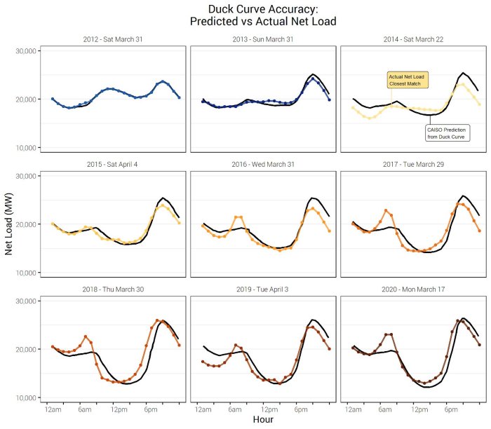 CAISO’s 2013 duck curve chart used data from March 31st and predicted the net load through 2020. Now that March 2020 is in the books, we can figure out how accurate CAISO’s predictions were. We pulled the hourly load data from CAISO’s website from late March and early April of each year, and compared it against CAISO’s predictions.