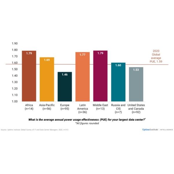 Despite PUE being an ineffective comparative index, The Uptime Institute still gathers this metric every year through its global data center survey, in hope of determining the annual progress of global data centers. In 2020, they gathered the PUEs of 450 global data centers, segmented the results, and found that companies in Europe emerged as the most energy-efficient, followed by data centers in North America, while the Middle East and Africa remained the least efficient.