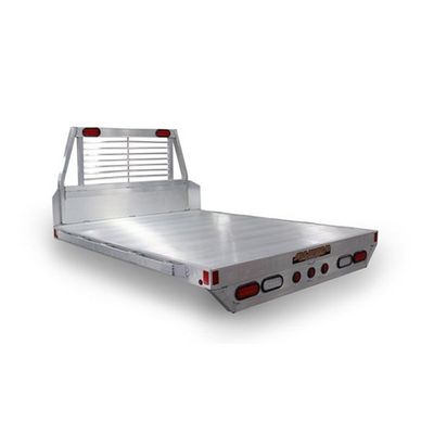 Extruded aluminum floor with drop rear skirt. Headache rack with lights. 3" Channel main stringers, adjustable to fit different truck models. LED Light package (2 tail lights, 7 clearance lights). License plate light. Pre-wired with lights installed. Back-up lights. 1/4" x 2" Rub rail with stake pockets.