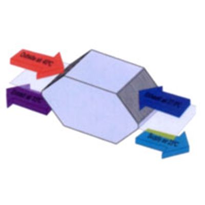 The two air streams are conducted past each other along thin parallel aluminium plates according to the counter flow principle. Up to 90% of the heat in the exhaust air is transferred to the ingoing air, without any smells or humidity being exchanged.