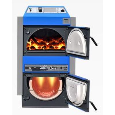 The boilers are constructed for burning wood and coal (lignite) on the principle of generator gasifying with the use of a gas exhaust ventilator, which withdraws the combustion gases from the boiler. The boiler body is produced as a weldment of 3 - 8 mm steel sheets. The boiler consists of two chambers, one placed upon the other. The upper chamber makes up the fuel container, and the lower one, combustion chamber and ash collector. Between the two chambers, a new, rotating, patent protected grate is placed. The grate ensures perfect combustion of coal, wood, or a combination thereof, as well as simple cleaning.