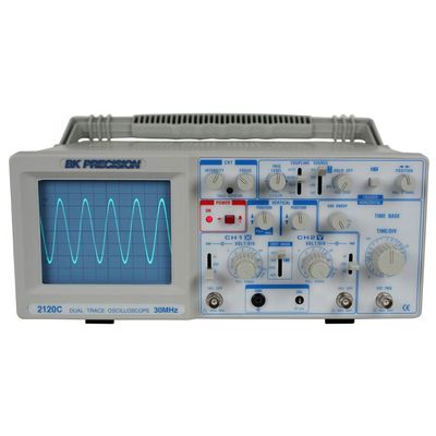B&K Precision`s model 2120C is a dual trace oscilloscope that offers high performance at a low price. Most competitor`s entry level oscilloscopes have a 20 MHz bandwidth, while B&K Precision`s models 2120C has a bandwidth of 30 MHz. This oscilloscope is built by and backed by B&K Precision, a company that has been selling reliable, durable, value priced test instruments for over 60 years.