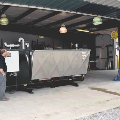 Stainless Steel. Processes 750-4000 pounds (340-1814 kg) in a single cycle. Trailer-mounted; propane heating system, onboard Generac generator provides power supply with quiet operation. A completely self-contained system ready to operate in the field.