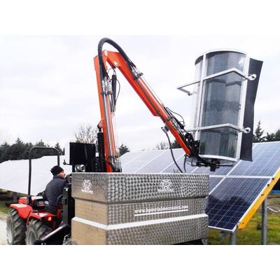 B.P. Metalmeccanica, very attentive to photovoltaic sector’s users needs , has expanded its solar cleaning machines’s range on ground systems, designing and building SOLAR CLEANER F1750T, applicable to agricultural tractors or telescopic handlers to meet particular needs of the operators. The machine is positioned on a base and is composed of arm, water tank and brush. Work capacity on both sides. Work phase automatically managed by sensors placed on the brush body. Hydraulic system driven by PTO tractor. Electrical system with PLC for machine management.
