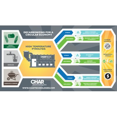 CharTech Solutions’ proprietary High Temperature Pyrolysis (HTP) technology transforms challenging organic waste streams (biomass, biosolids, digestate) into three renewable and valuable outputs by heating the materials at high temperatures in the absence of oxygen. The HTP process converts a portion of the organic feedstock into a high-calorific value and hydrogen-rich syngas. This syngas can be applied in a variety of ways; offsetting natural gas consumption for industrial processes, as well as the generation of power, green hydrogen, and Renewable Natural Gas (RNG). The HTP process is autothermal, creates its own energy, and therefore does not need external heat sources. Excess energy is generated from the process, resulting in a carbon negative process for organic waste streams.