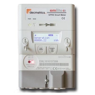 The Emlite EMC1.w Twin Element meter has two 100A terminals for independent measurement of energy from 2 circuits . The meter is intended for accurate measurement of net energy consumption when installed as a generation meter. The second terminal measures grid import and export energy when there is surplus from PV generation. Net consumption is calculated and displayed to show how solar energy is being utilised.