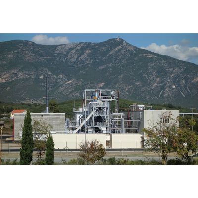 The system consists of a hot gas generator, connected to a thermal oil boiler for heating the oil required to operate a 999KWe ORC turbine. Excess heat is recovered in internal production processes.