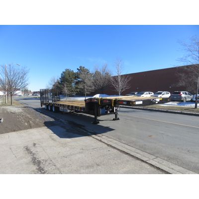 Hydraulic Neck on Dual 8" Cylinders Mechanical Neck Also Available. 53` Trailer with 25` Deck on 60" Spread. QT-100 Fabricated I-Beams. Air-Operated Locking Gooseneck Pin. 24" Standard Deck Height, 8" Ground Clearance. 5-Position Cam Lock for Adjustable Front Ground Clearance. Tridem IMT/Dexter Axles and Suspension. 2 Built-in Storage boxes, Between Main Rails. Center Boom Well in Rear Bridge, with Hammer Plate. Deck Built with Positive Camber. Open Wheel Well Style. PTO Powered. 10" Flip-Out Outriggers Every 2`, Comes with Flip-Out Extremity Marker Lights. Riding on 275/70R22.5 Continental Dual Wheels. Low Approach Angle. Rear Strobe Lights, with Accessory Battery and Switch.
