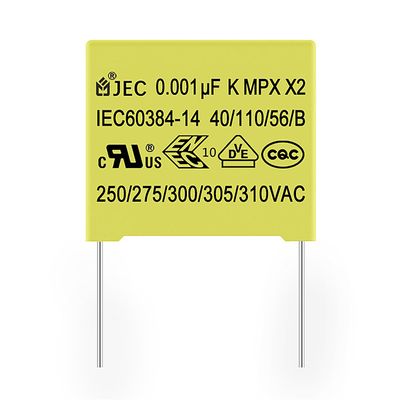 Electrical Characteristics: Product name: X2 Safety Capacitor. Polypropylene Film Capacitor. Type: MPX (MKP). Approval Standards: IEC 60384-14. Features: Non-inductive structure, High moisture-resistance, Self-healing property, Flame retardant type(compliance with UL94V-0), Very small loss, Excellent frequency and temperature characteristics, High insulation resistance