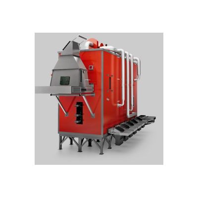 Output range: from 750 till 4000 kW. KAPAK series front furnace with moving grates, hot water boiler and multicyclone. KAPAK series device integrates a moving-sloping grate pre-furnace, three-way horizontal water boiler and multicyclone. This design ensures minimum size of the equipment, as well as speeds up the assembly work processes. The combustion gas flow direction and water ensures efficient heat exchange, making full use of the resources. The moving-sloping grate furnace with a water boiler and multicyclone in combination with fuel feed mechanism and automated ash discharge system is intended for burning loose biomass with a moisture content of 10-50%.