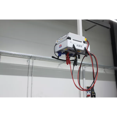 The E-Box for media supply for utility chargers is a suspended power supply unit made from aluminium, which is ceiling mounted. The equipment includes a connected 5 m cable, power connection (4 x 220 Volt), compressed air connection with safety couplings. Optional extras include the fitting of a lift control, LAN CAT6 sockets or electric power sockets. The E-Box is suitable for chargers from the brands GYS FLASH, DEUTRONIC and Eltek.