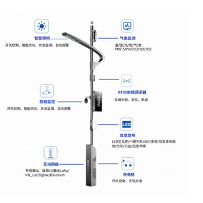 Smart street lights rely on street poles and smart lighting, integrated 5G base station, WIFI coverage, environmental information collection, surveillance cameras, information display, background music, car charging piles, mobile phone emergency charging, one-click emergency warning, multi-function interactive screen and other sub-function functions; mainly used in science and technology parks, park scenic spots, characteristic towns, city squares and landscape streets.