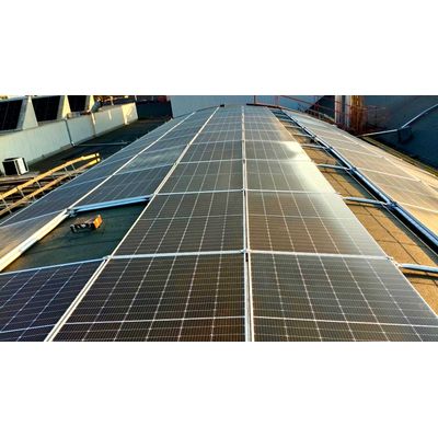 Fully supported on the roof surface, the Omniablok system seamlessly accommodates flat surfaces. Its cohesive design forms a unified structure, with an approximate incidence of 9,8 Kg/m². Whether oriented to the south or east-west, The system allows adjustable panel tilting to meet desired specifications. Additionally, a thin rubber layer is positioned beneath each casting to safeguard the roof membrane.