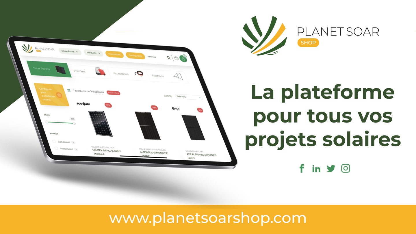 Planet Soar Shop is a one-stop-shop for photovoltaic equipment: * Solar Panels * Solar Inverters * Solar Batteries * Fixations * Accessories * Online Show Room Promoting best quality products and on the market competitive prices. Our online store also has a unique section of sophisticated products that allows you to visualize complex projects in a simple and efficient way.
