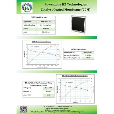 The heart of the fuel cell is a polymer electrolyte membrane (PEM) coated with platinum-based catalyst on both sides (Catalyst Coated Membrane, CCM). Producing the best quality and value based CCM locally that contribute to the mass acceptance of hydrogen fuel cell technologies globally Product Features: 1. Customizable CCM design 2. Suitable for different PEM fuel cells systems 3. Proprietary catalyst ink formulation 4. Cost-competitive CCM manufacturing process 5. Robust reliability and high performance CCM for air-cooled fuel cells 6. Flexibility to OEM companies developing power solutions from Low to High Power. 7. Offering zero-emission for a variety of applicationPowerzone H2 - MEA - Membrane Electrode Assembly