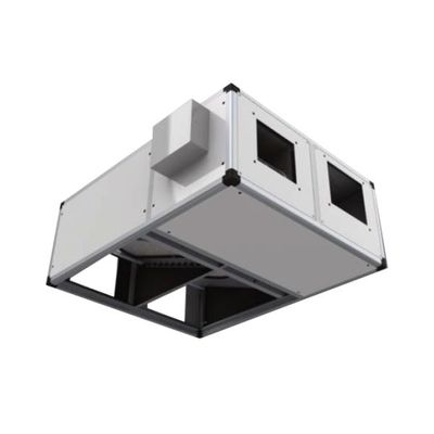 Fresh air terminal unit with counterflow opposing flow static heat recovery. Recovery unit: very high yield static type with aluminium plates with counterflow with close step. Side extraction of exchange pack (except for size 40 which is extracted from the bottom). Fans: fresh air inlet and forward blade double intake centrifugal expulsion type with a continuously adjustable directly coupled electric motor; optionally, EC Brushless technology high efficiency electric motors. Fan unit installed on anti-vibration mountings to prevent the transmission of vibration to the structure. The EC fans can be factory set for operation with constant flow (specification to be provided in order)