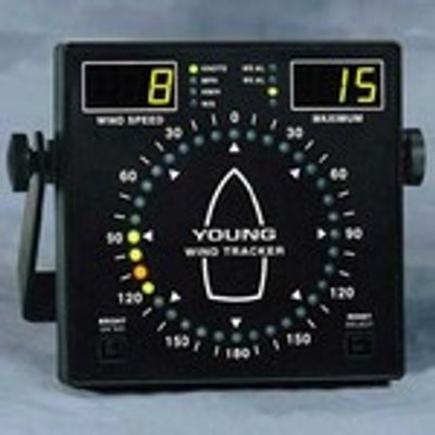 Developed from the standard Wind Tracker, the Marine Wind Tracker has special features for shipboard use. Wind speed is displayed in your choice of units: KNOTS, MPH, KM/H, MIS. Maximum wind speed is saved on the display until reset by the operator. Wind direction information is clearly displayed on a circular pattern of LEDs. Bold front panel graphics give a quick indication of wind angle relative to vessel heading. Brightness control allows adjustment for best viewing in any light. Luminous front panel markings allow viewing even in a darkened pilothouse.