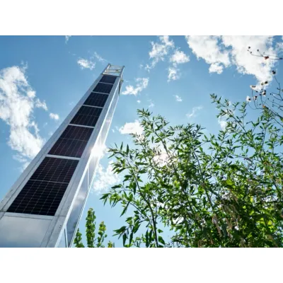 The SPT Series is a highly efficient, intelligent, and autonomous solar utility tower designed for large-scale deployments in areas with limited or nonexistent infrastructure. Equipped with high-performance photovoltaic panels, the SPT offers exceptional energy yields while maintaining a small ground footprint. The structure is built with a corrosion-resistant aluminum alloy chassis, securing its PV panels, electronic components, and battery bank within its vertical framework, thereby minimizing risks of theft and vandalism. Its vertical design also enables low maintenance as wind and rain naturally clean the exposed surfaces. The SPT provides continuous energy production from dawn to dusk. The upper section allows the installation of various telecommunication devices such as MIMO antennas for 5G networks, while the lower section supports security and lighting devices including cameras, emergency phones, and floodlights. Additionally, the SPT features a remote live monitoring system that alerts site operators of any technical issues or unauthorized access in real time. Its versatility makes it suitable for applications in communications, security, electrification, and lighting, offering a single, reliable, and autonomous solution for powering multiple technologies simultaneously.