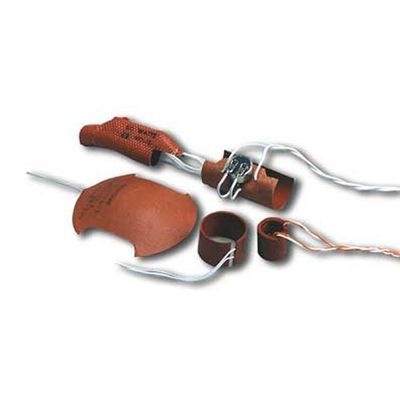 Silicone Rubber Heaters with Insulation. Available in a wide variety of shapes and sizes, these units are typically simple, rugged, economical and resistant to moisture and chemicals. Thin and flexible, they are easily bonded, and may be used in flat positions or wrapped around curved and irregular shapes. Maximum operating temperatures are in the range of 450 degrees F (232 degrees C). Thermostats, thermistors and sensors may be incorporated into their design, and a variety of adhesive or bonding possibilities are available.