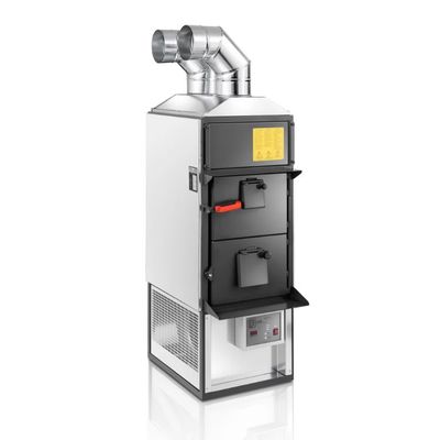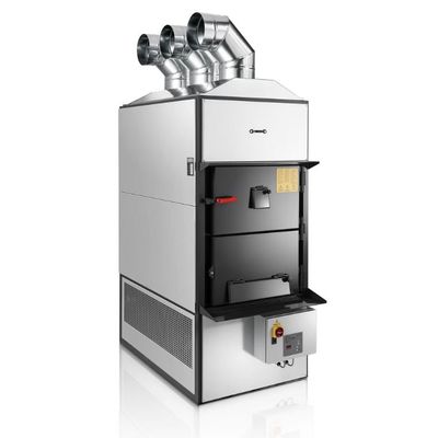 Larger workshop & factory heating or medium sized poorly insulated buildings. Wood and waste burning hot air heater. With up to 93kW heat output. 3 phase electric supply. Fitted with chimney assist fan.
