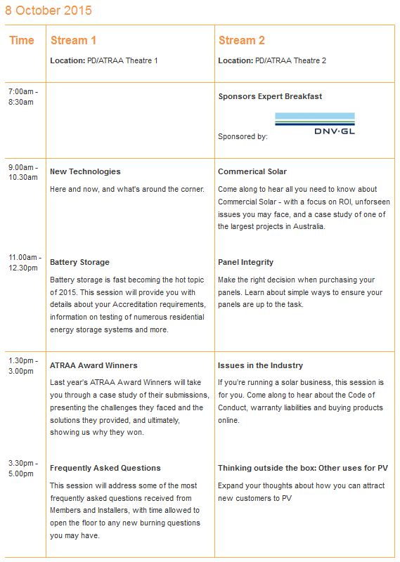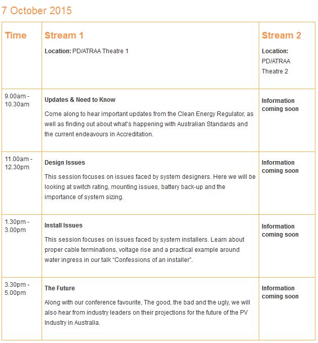 Designers and installers will get the latest updates on standards and compliance issues from speakers including the Clean Energy Regulator, and will hear from industry experts on their predictions for the next big thing in the future of solar PV. A PD Day favourite, ‘the good, the bad and the ugly’, will also return in 2015 – so don’t miss out.
