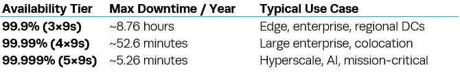 Data-center reliability is rarely a binary question of “does it work or not?” Instead, it is defined by explicit availability tiers – typically three nines (99.9%), four nines (99.99%), or five nines (99.999%) – each with very different implications for system architecture, redundancy, and cost.
