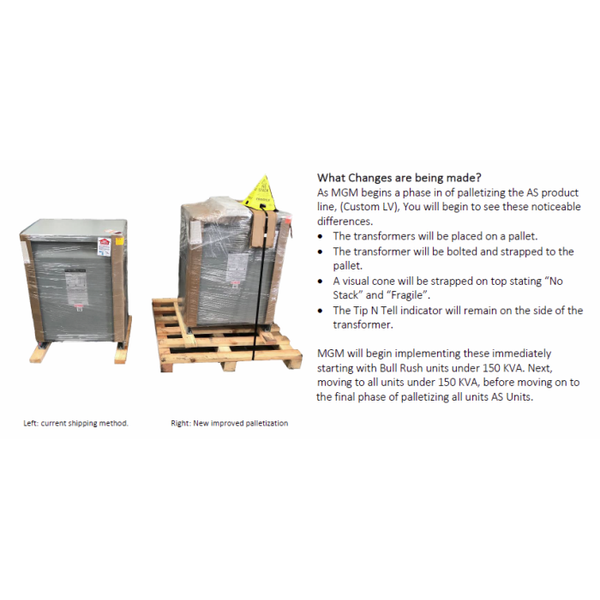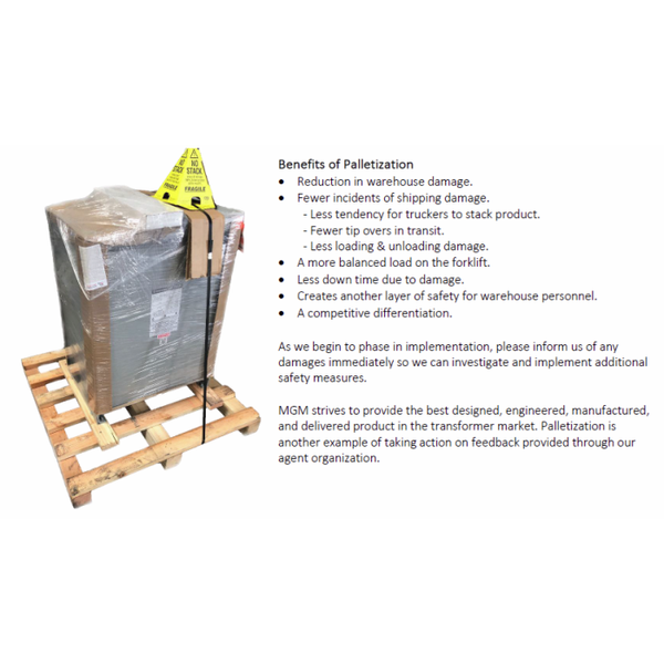 From April 2021 onwards, MGM Transformer Company has started to palletize Low Voltage Custom transformers.