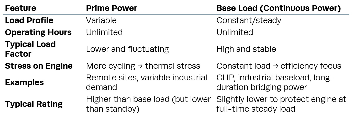 - Prime power models the role where the engine is running regularly and carrying varying load depending on grid conditions or battery interactions (e.g., 4–12 hours per day with fluctuating AI loads).