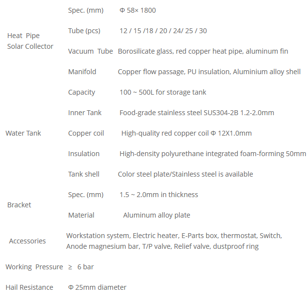The split pressurized solar water heater composes of heat pipe solar collector, storage water tank, workstation system, accessories and interconnecting pieces.
